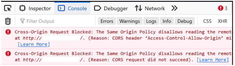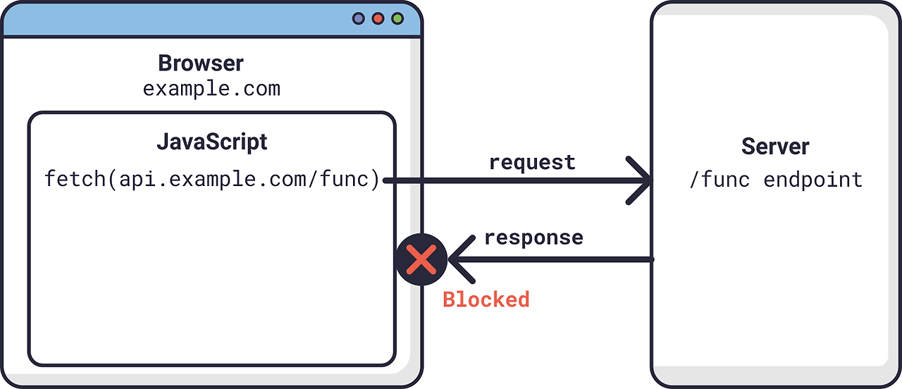 위의 예에서는 웹 페이지는 example.com 으로 부터 발행되서 그 안에서 api.example.com/func 을 액세스하고 있지만 엄격히 말해 서브도메인도 별도의 도메인으로 취급되므로 아래와 같은 에러가 발생하게 된다.