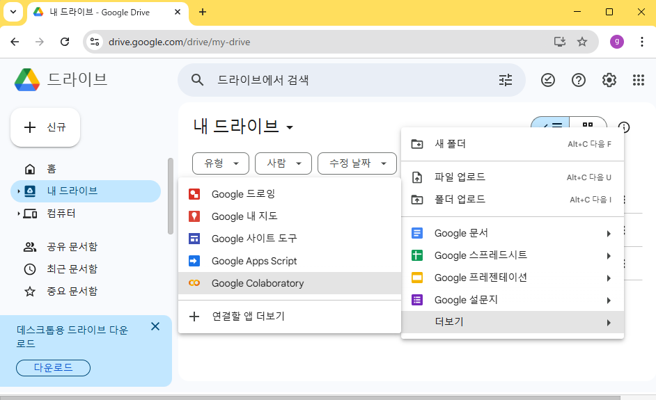 내 드라이브에서 마우스 오른쪽 클릭 메뉴에서 Google Colaboratory 를 선택