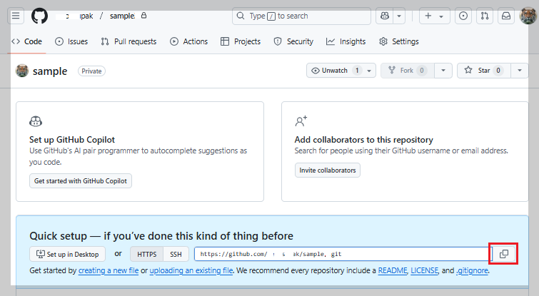 - 생성된 리포지트리 화면에서 Code 를 클리하여 URL 을 카피한다.