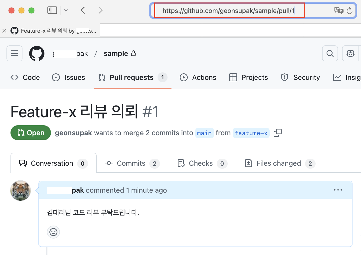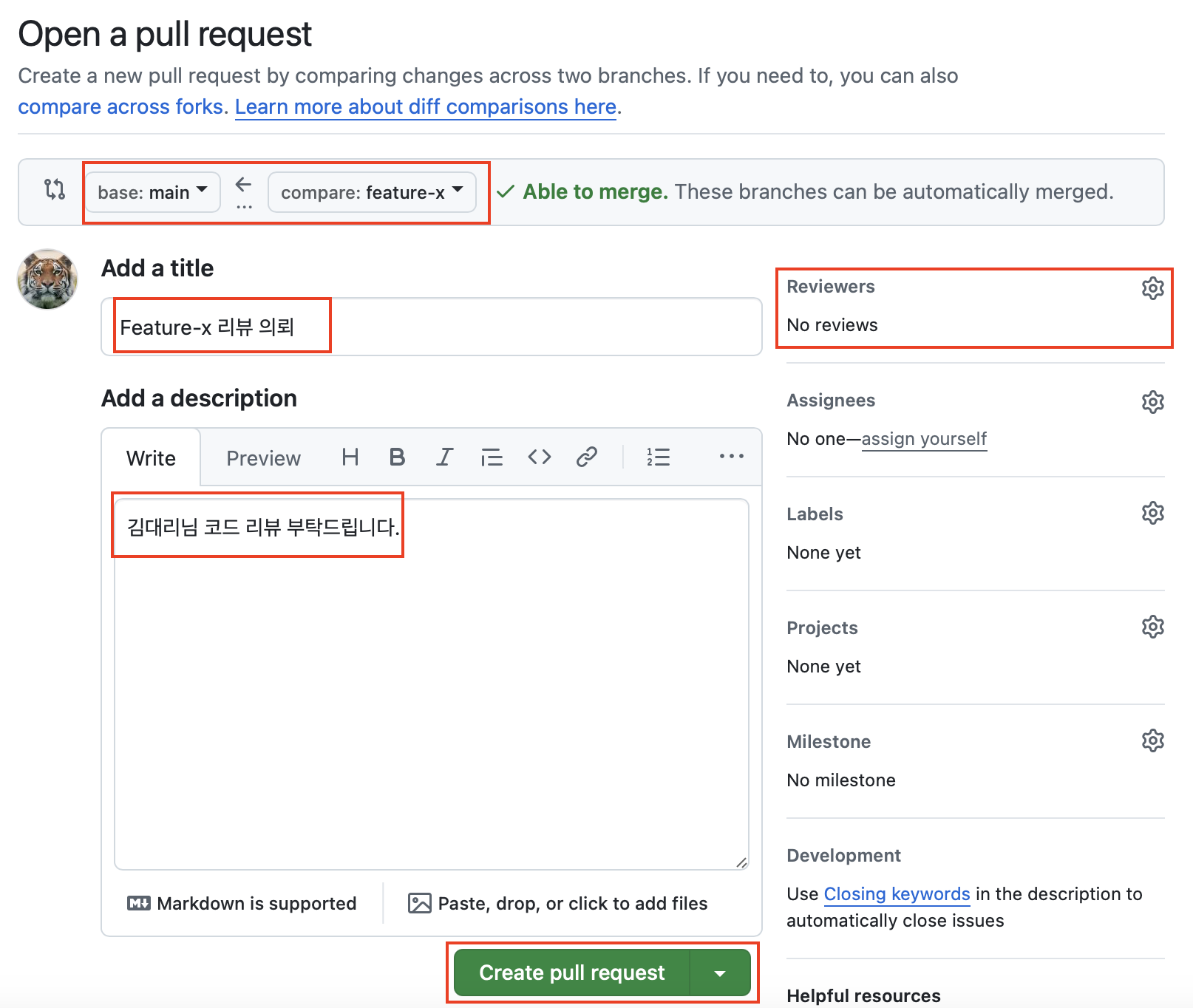 리뷰의뢰 github.com 로그인 Compare & pull request 버튼이 활성화 버튼을 클릭하면 Open a pull request 페이지 전환 -> title과 의뢰 내용을 입력한 후 Create pull request 의뢰 URL 주소를 카피하여 리뉴 담당자들에 통지 |