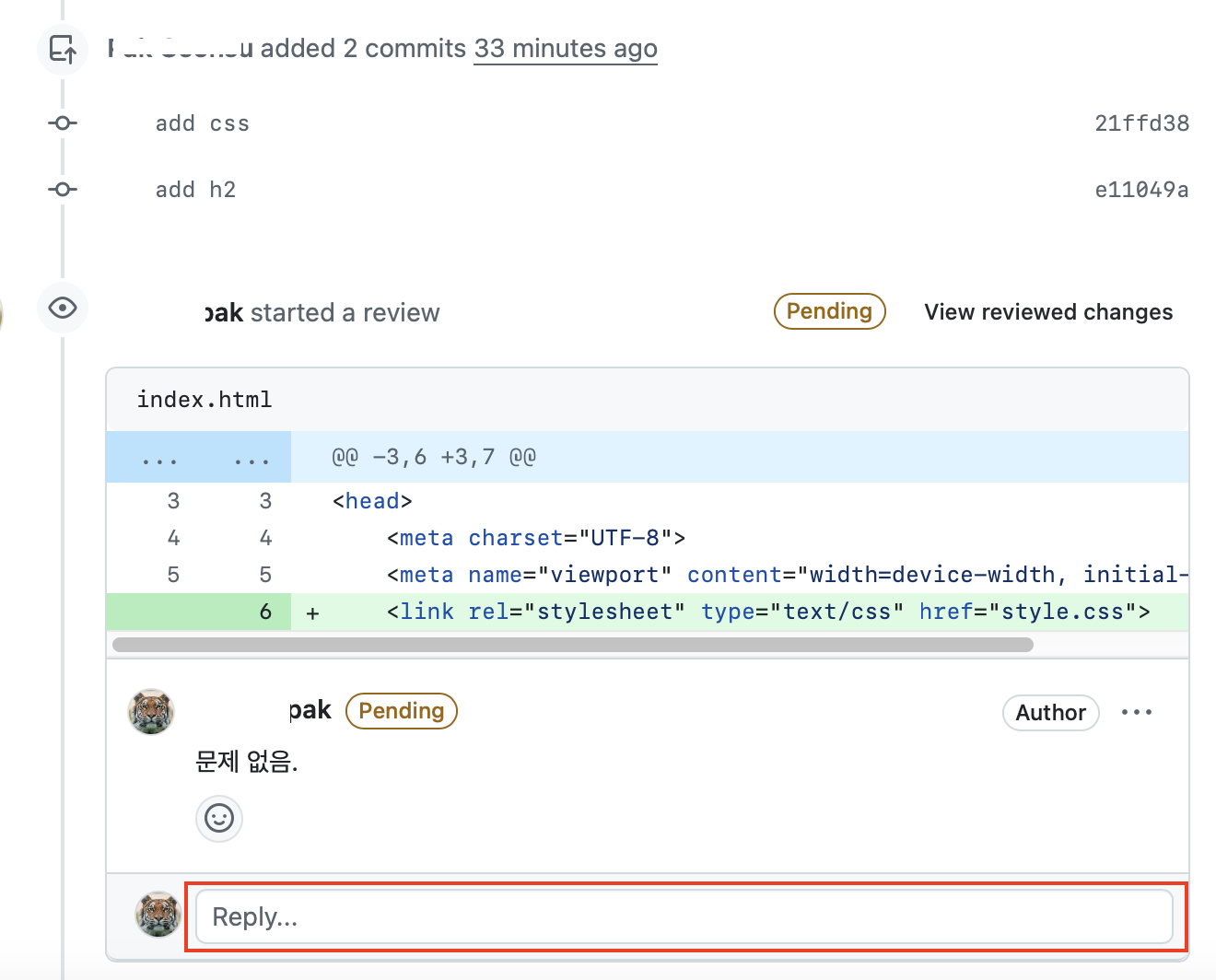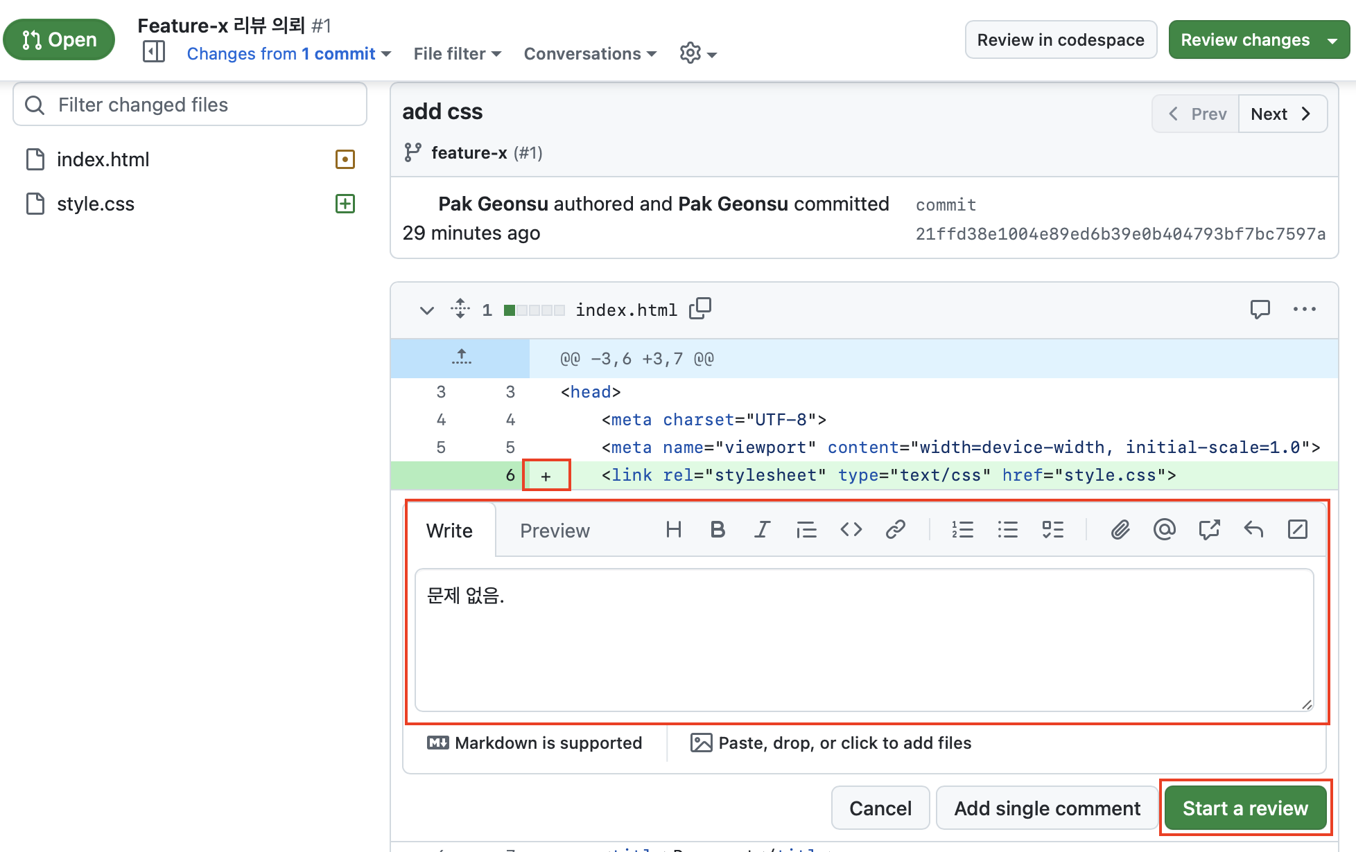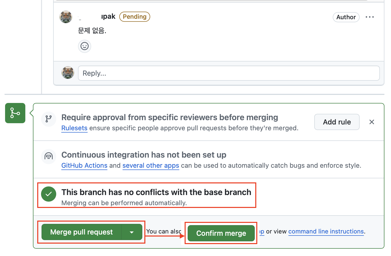 리뷰 담당자 리뷰어 리스트에 등록되어 있다면 자신을 선택 commit 리스트가 표시( 내림차순 ) -> 클릭하면 상세 내용 표시 + 를 클릭하여 컴멘트할 내용이 있으면 작성후 Start a review 를 클릭 전달할 내용이 있으면 Reply ... 소스간 충돌이 없음을 화인 후 Merge pull request 를 클릭하면 Comfirm merge 화면으로 전환 되면 클릭 |