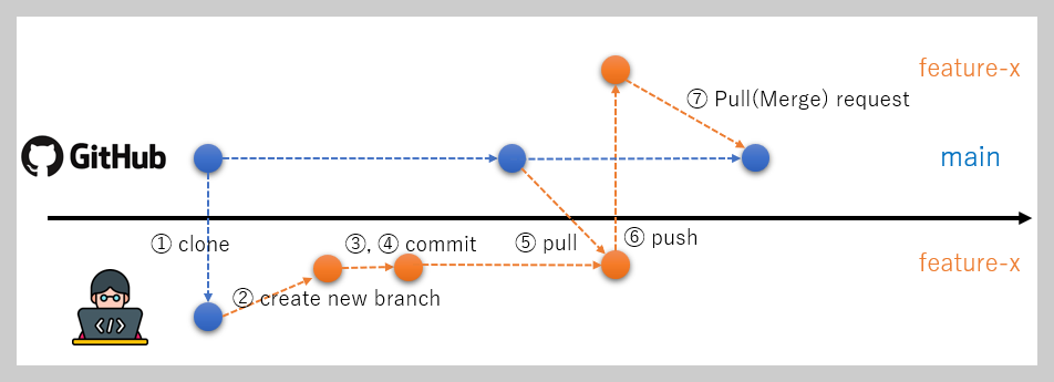 | ⑥ | git push origin feature-x | 리모트 리포지트리에 featue-x 브랜치를 생성 |
