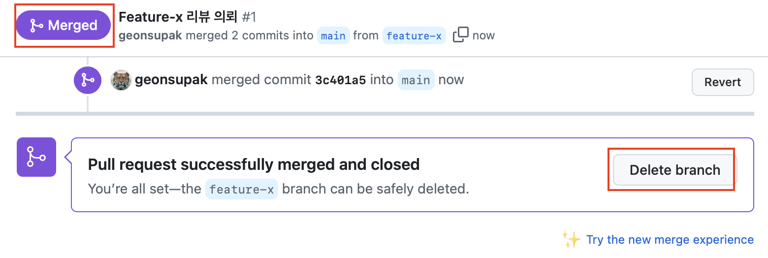 Merged 가 표시되고 Delete branch 를 클릭하여 브랜치는 지우도록 한다. |