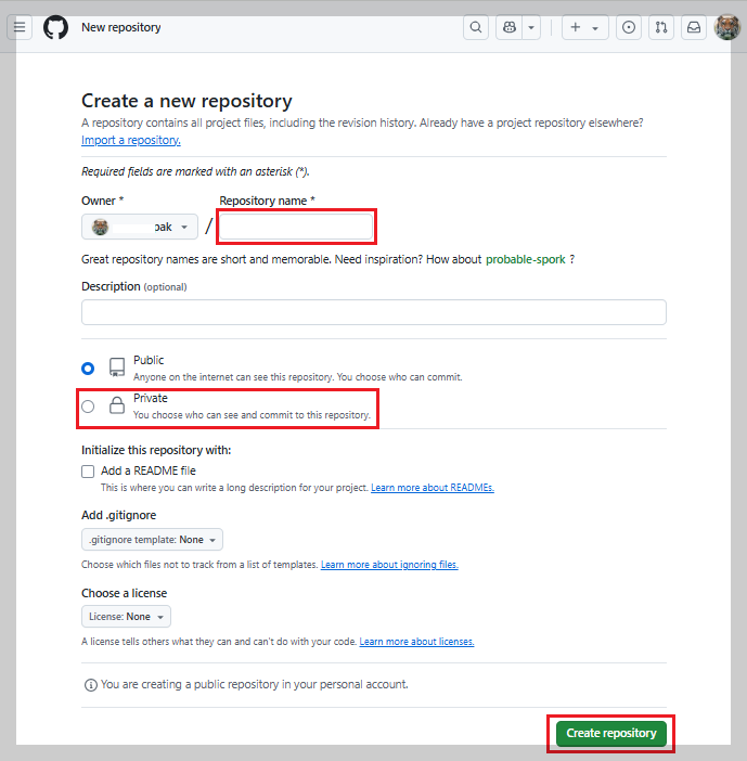- 외부에 공개하지 않는 경우에는 Private를 체크하고 나머지는 디폴트설정 후 Create repository