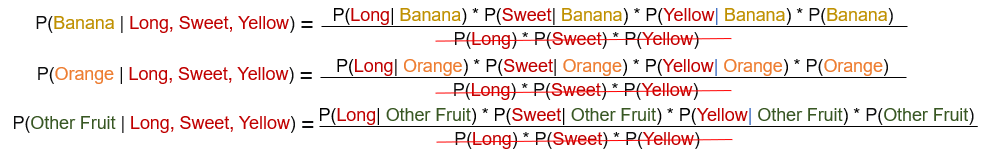 P(Other Fruit| Long, Sweet, Yellow) = 0.5 * 0.75 * 0.25 * 0.2 / (동일값이므로 무시) = 0.01875