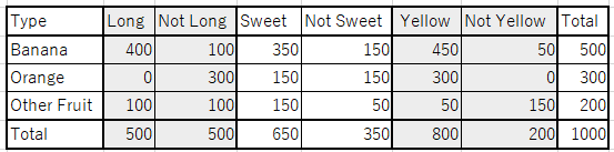 | Banana일때 Not Long의 확률 | P(Not Long | Banana) | 0.2 (100/500) |