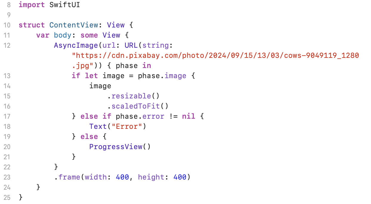Line 12 : 리모트 서버에 존재하는 이미지를 다운로드 하는 경우이므로 비동기 AsyncImage 를 이용