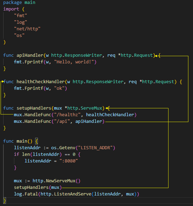 | $ curl localhost:8080/api Hello, world! $ curl localhost:8080/healthz ok |