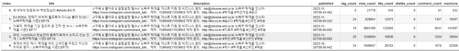 | (pandas) Youtube 노빠꾸탁재훈 채널 분석 (0) | 2023.11.18 |