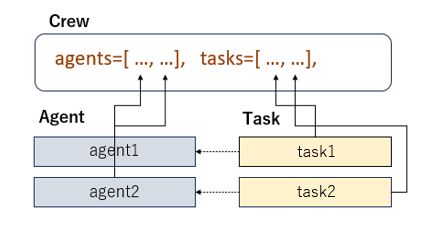 Agent 와 Task 를 정의하고 Task에는 속할 Agent를 지정한다. 이들을 Crew 에 등록해서 호출, 사용하게 된다.