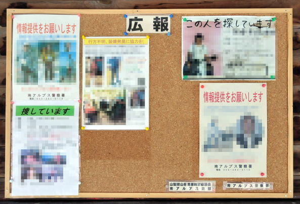 일본의 유명한 등산로 입구에는 아래와 같이 행방불명된 사람을 찾는 종이가 많이 붙어 있다.