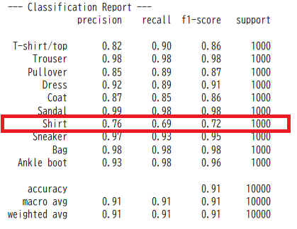 'Shirt'라는 카테고리 자체가 매우 다양한 스타일(드레스 셔츠, 캐주얼 셔츠, 블라우스 등)을 포함할 수 있습니다. 이 다양한 스타일들이 하나의 'Shirt'로 학습되기 때문에 모델이 공통된 특징을 학습하는 데 어려움을 겪을 수 있습니다. - 데이터 부족 또는 불균형 (품질):