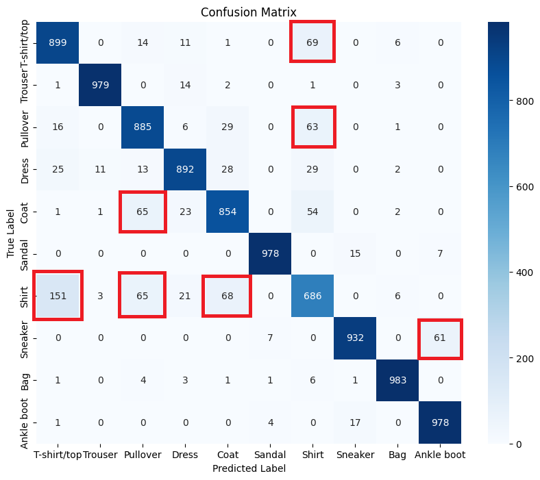 특히 Shirt 가 T-shirt/top 에 혼동되어 분류되었음을 알 수 있다.