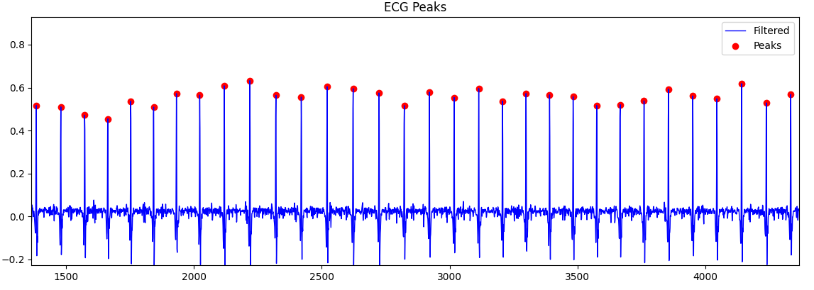 | from scipy.signal import find_peaks # distance = sample Hz / 2 으로 설정해서 이보다 작은 간격의 peaks 는 무시 rr_peaks, _ = find_peaks(filtered_data, distance=130*0.5) plt.title("ECG Peaks") plt.plot(self.product._filtered_data, color='blue', lw=1, label='Filtered') plt.scatter(rr_peaks, self.product._filtered_data[rr_peaks], color='red', label='Peaks') plt.xlim(0, 3000) plt.legend() plt.show() |