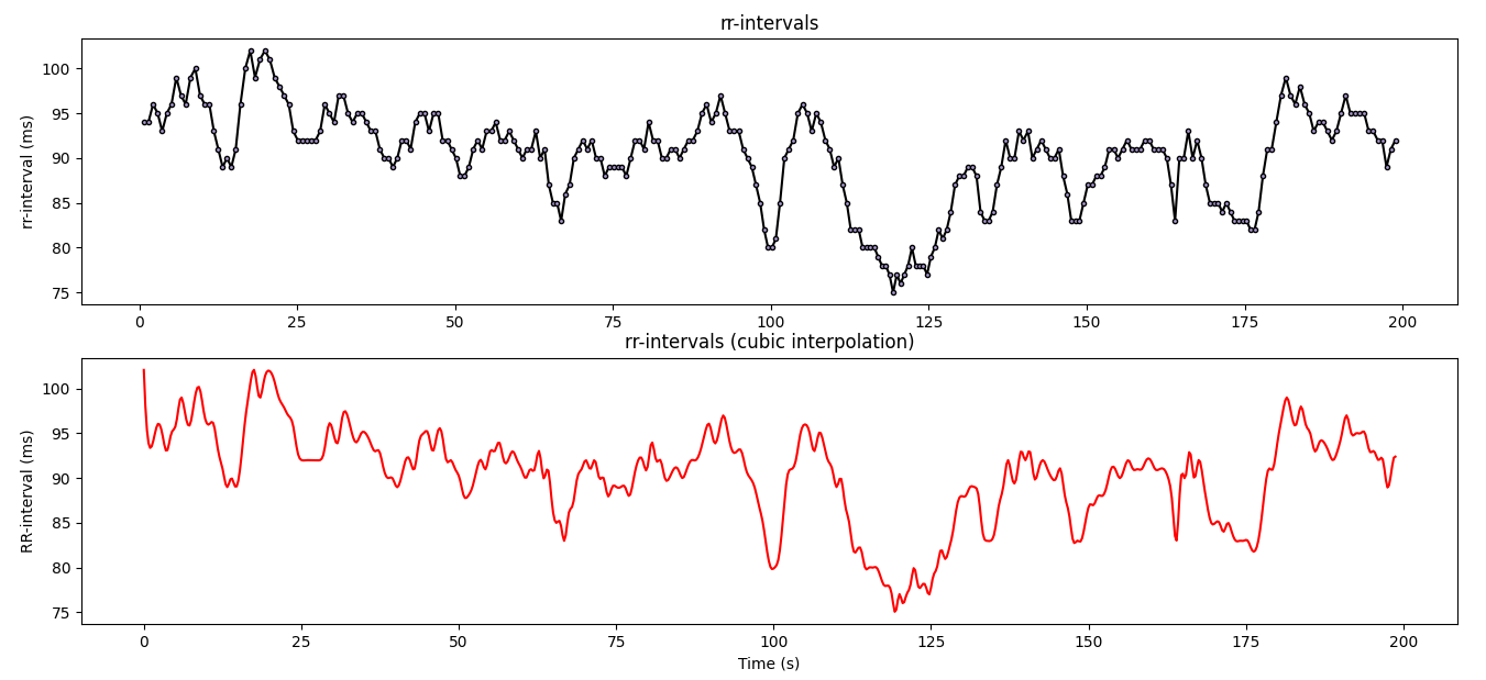 | plt.subplot(211) plt.title('rr-intervals') plt.plot(x_ecg, rr_ecg, color='k', markerfacecolor='#A999D1',marker='o', markersize=3) plt.ylabel('rr-interval (ms)') plt.subplot(212) plt.title('rr-intervals (cubic interpolation)') plt.plot(xx_ecg, rr_interpolated_ecg, color='r') plt.xlabel('Time (s)') plt.ylabel('RR-interval (ms)') plt.show() |