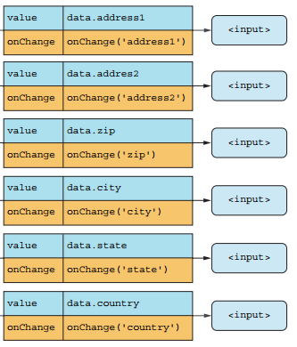 <label>Address line 2: <input value={data.address2} name="address2" onChange={onChange} /> </label> |
