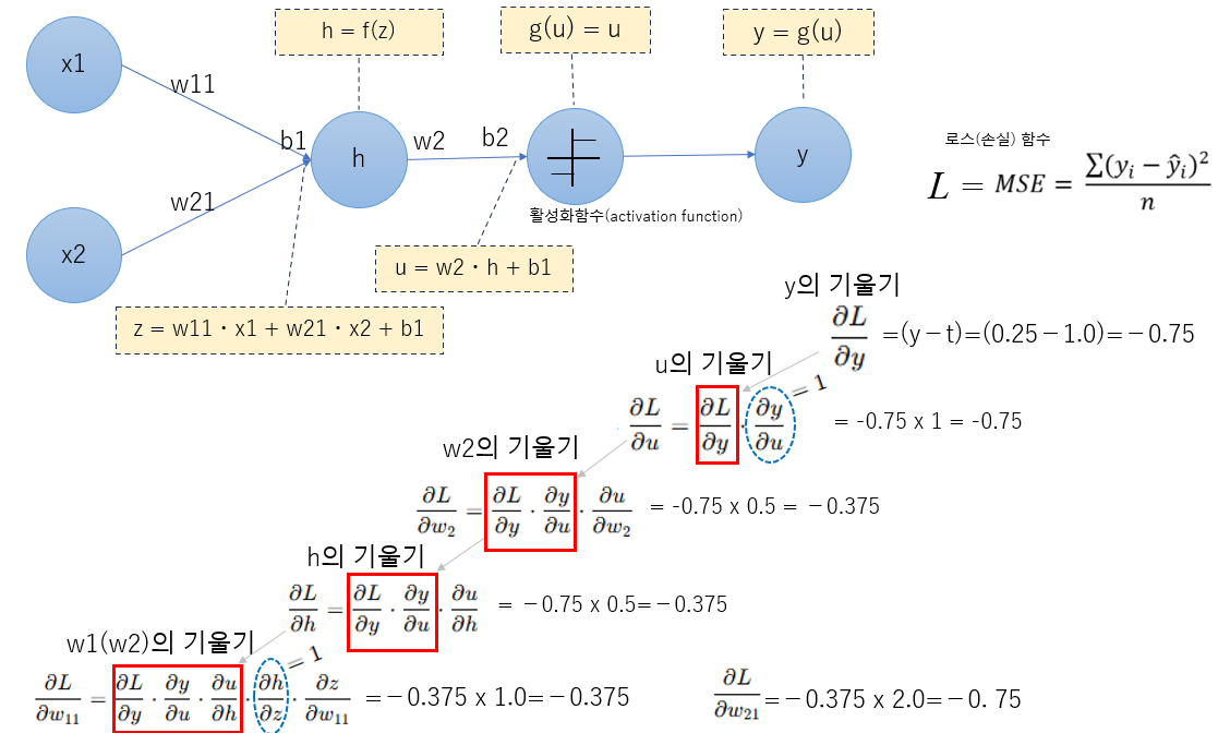 ※ y, u, h 의 기울기는 다음 w와 b의 기울기를 계산하기 위해 사용됩니다.