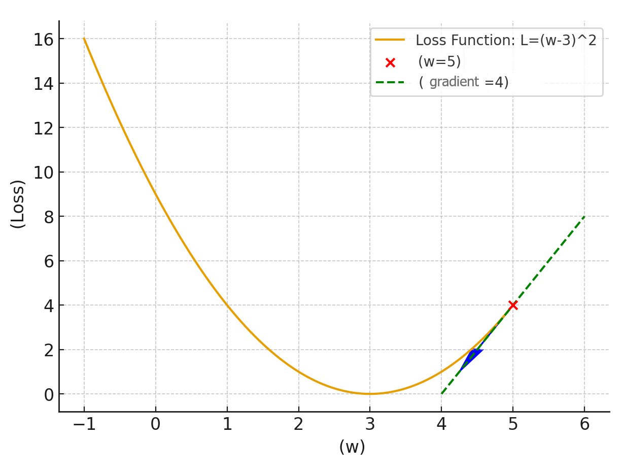 - 예: w= 에서의 기울기가 양수라면, 오른쪽으로 갈수록 값이 커진다는 의미 → 따라서 로스를 줄이려면 왼쪽(– 방향) 으로 이동해야 합니다.