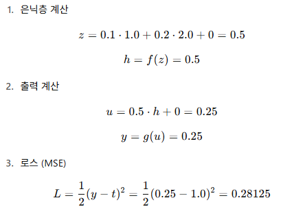 - 파라미터: w11=0.1, w21=0.2, b1=0.0, w2=0.5, b2=0.0